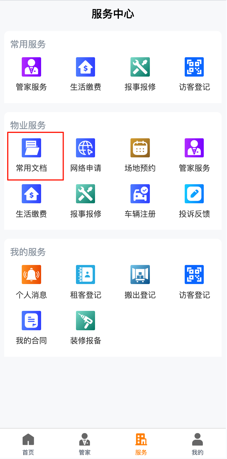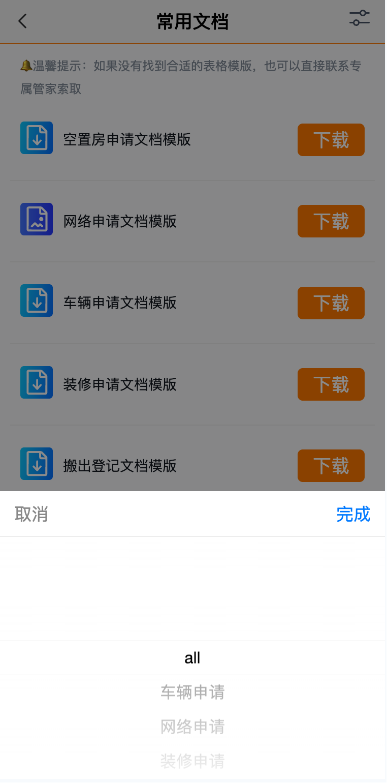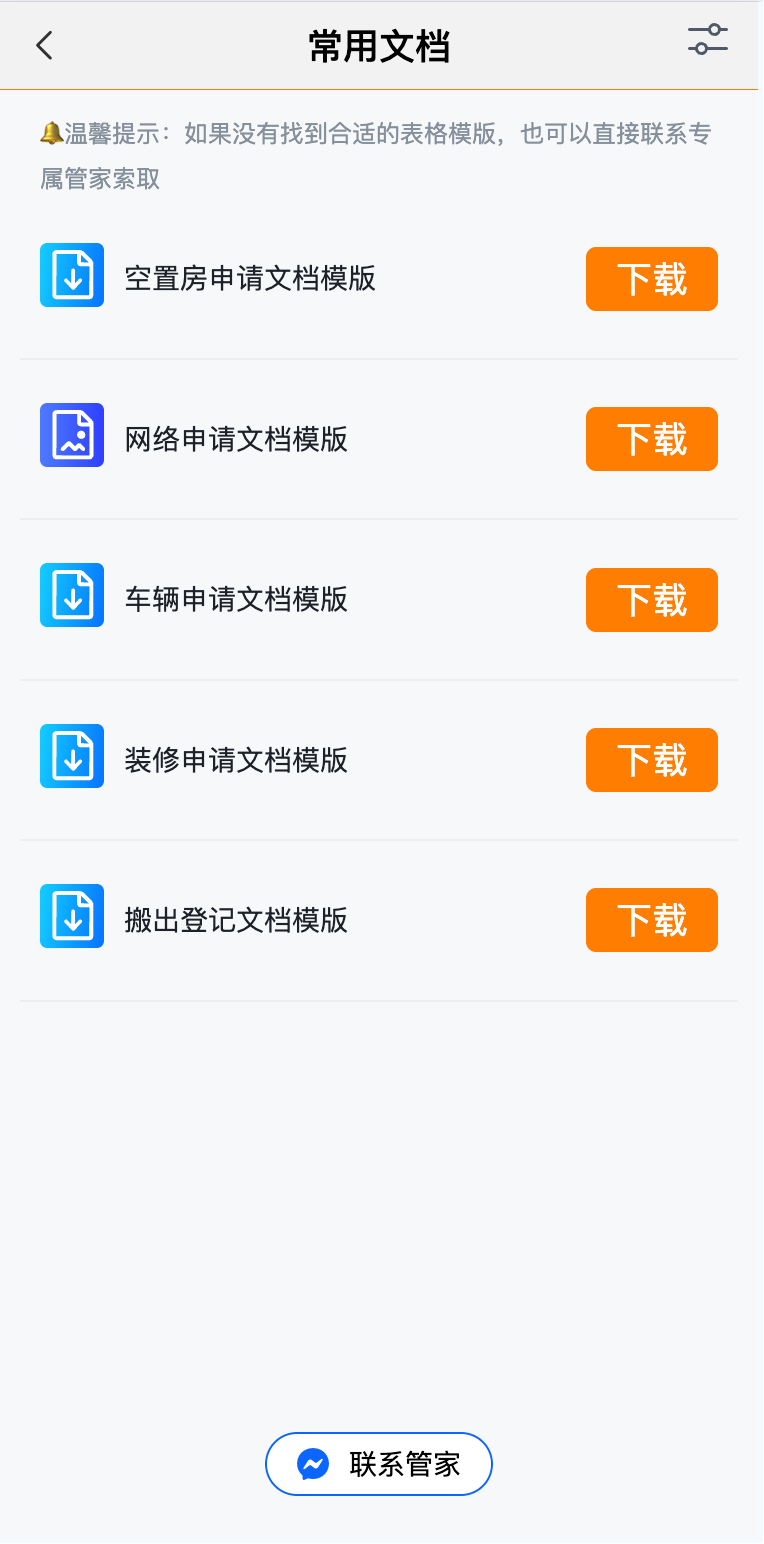作为一个 业主/租户 我想要 在线下载常用文档模版 以便于 快速申请登记填写相关信息